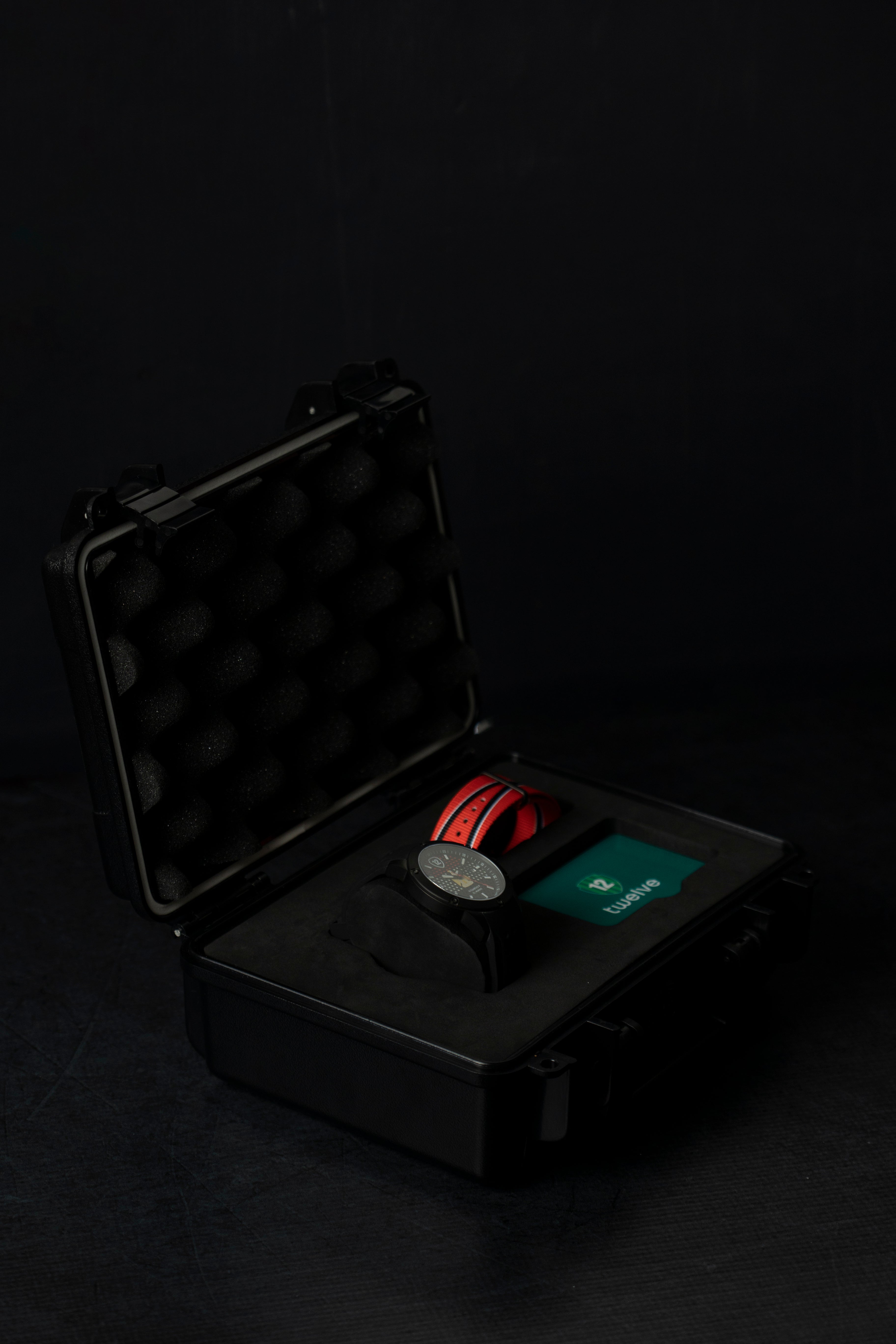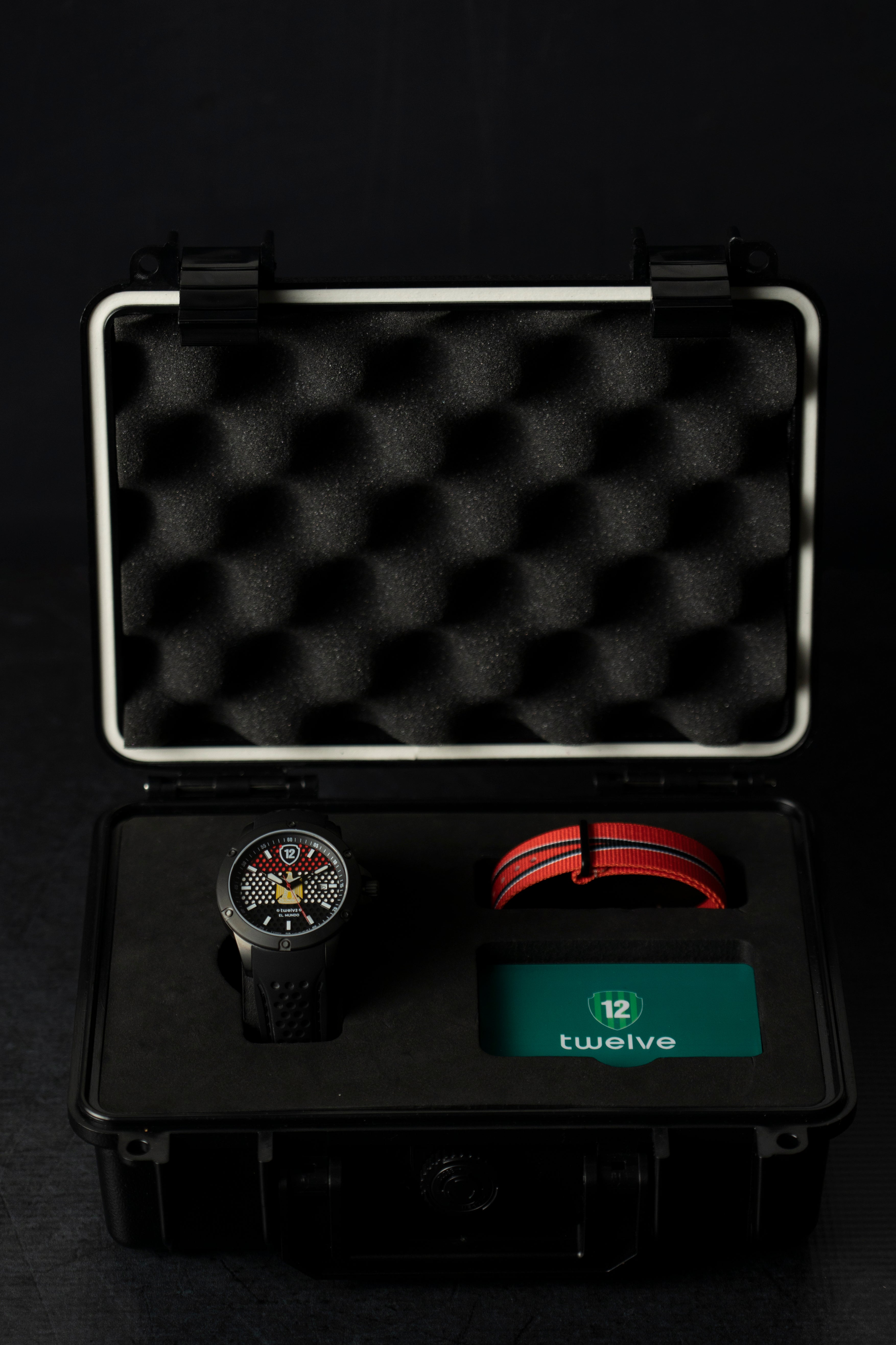 A chic, modern 44mm quartz Swiss movement watch with a colorful textured dial paired with a black rubber strap and one additional colored nato strap to match the dial.